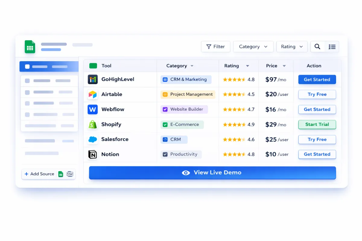 Turn any spreadsheet into a live web table you can search, filter, and embed.