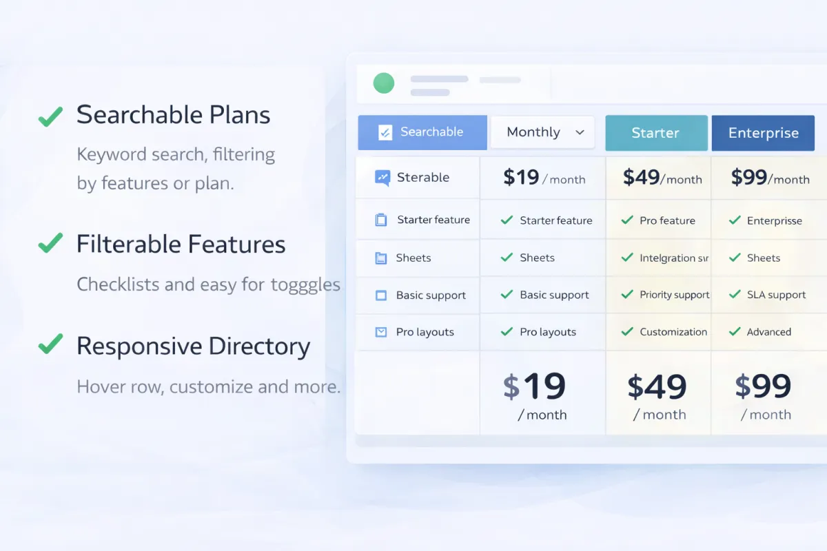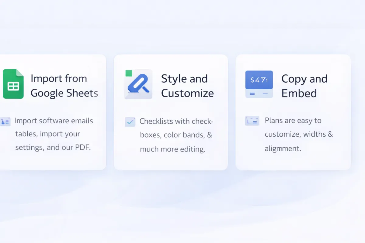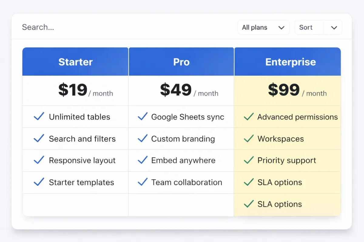 Build an interactive pricing comparison table for your SaaS, software, or product offering and embed it anywhere.